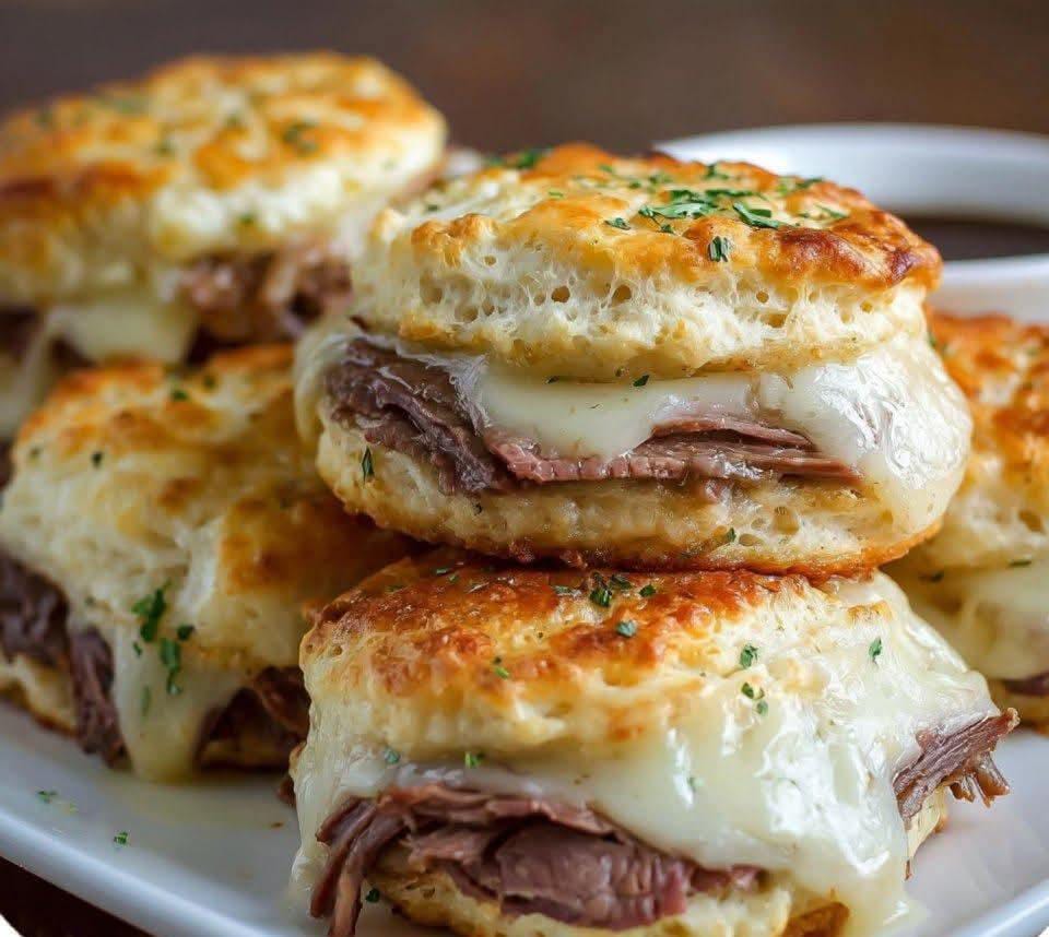 Prepare au jus according to package instructions. Serve biscuits warm with au jus on the side for dipping.