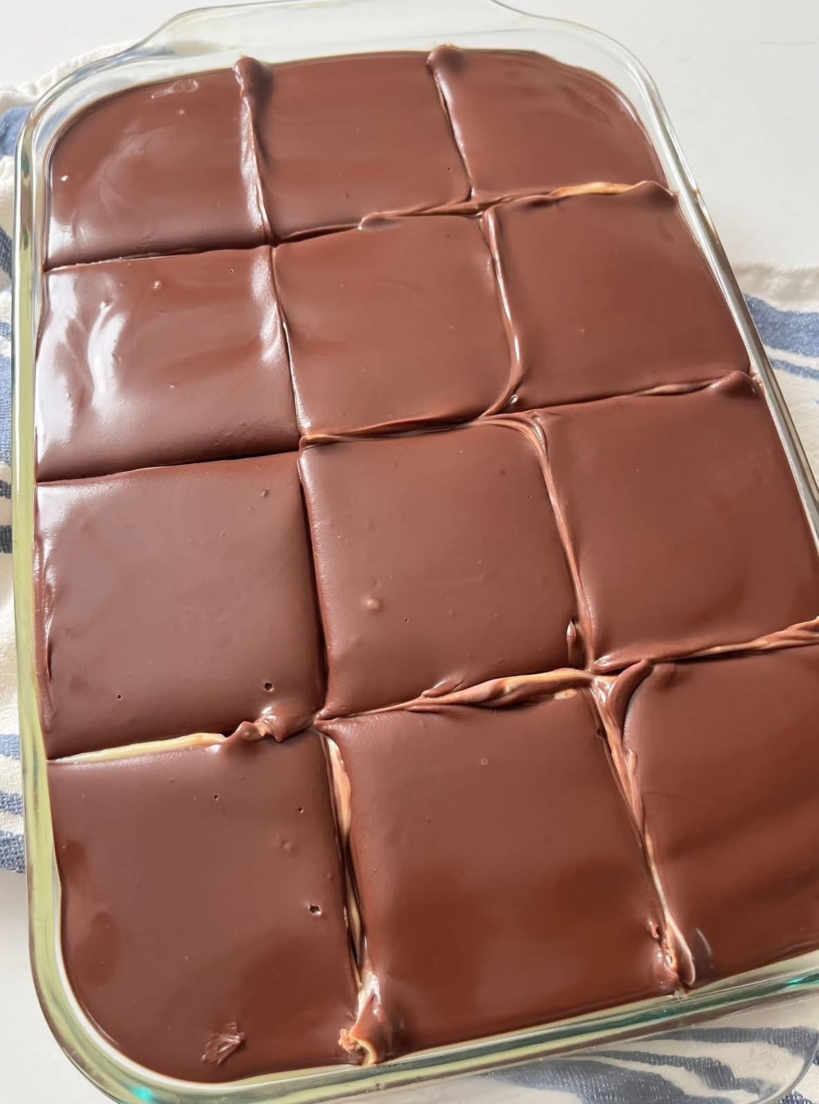 Pour the ganache over the cake, spreading it evenly across the top. Allow it to set before serving.