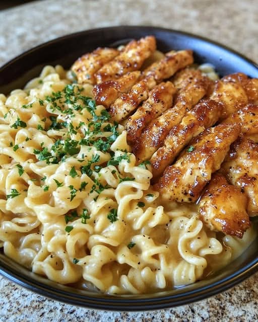 Combine the garlic butter chicken bites with the creamy noodles, toss to combine, and serve hot. Enjoy!