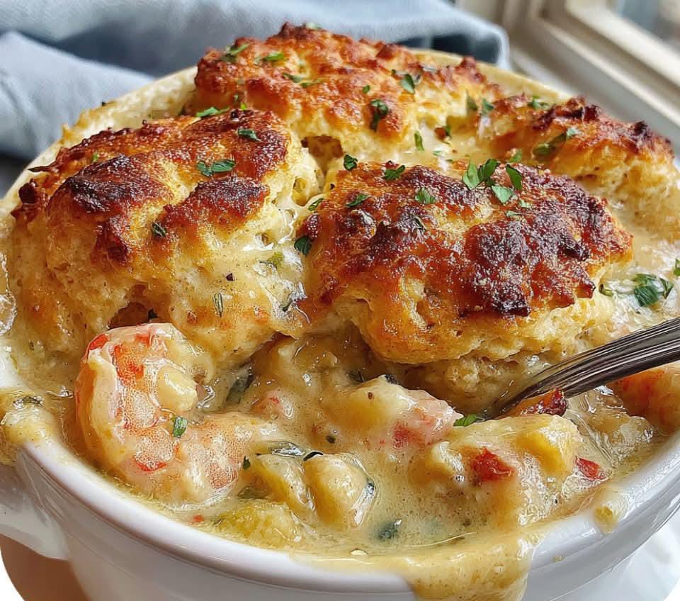 Creamy, rich seafood filling topped with fluffy, cheesy Cheddar Bay–style biscuits. This is a comforting oven-baked dinner that looks impressive but is very easy to make.