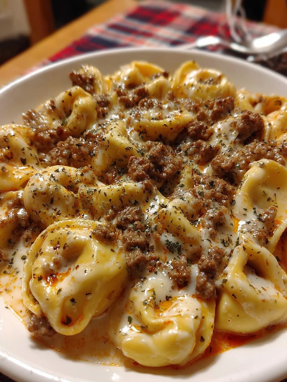 CHEESY GROUND BEEF TORTELLINI IN CREAMY GARLIC HERB PARMESAN SAUCE