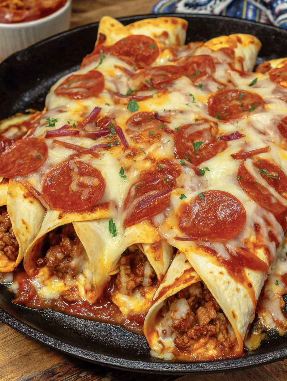 A comforting fusion dish that blends two classics—creamy, cheesy enchiladas and bold pizza flavors—into one irresistible, family-friendly meal. These enchiladas come loaded with seasoned beef, gooey cheese, pepperoni, and a rich pizza-enchilada sauce that makes every bite unforgettable.