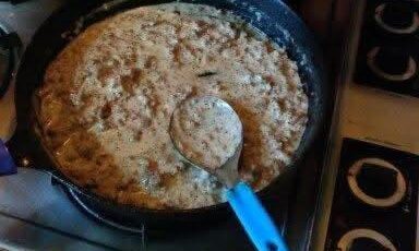 7. Make the frosting: In a small saucepan, melt ½ cup butter with ½ cup peanut butter. Bring just to a boil, then remove from heat. Stir in 2 tablespoons milk, then gradually mix in the powdered sugar until smooth.