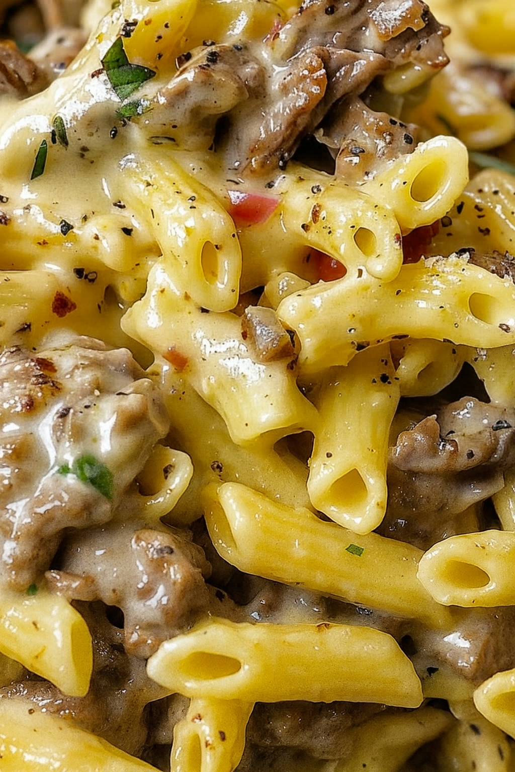 This pasta tastes like a creamy cheesesteak in a bowl — comforting, rich, and incredibly satisfying. The combination of beef, onions, melted cheese, and pasta creates a dish that feels indulgent and irresistible.