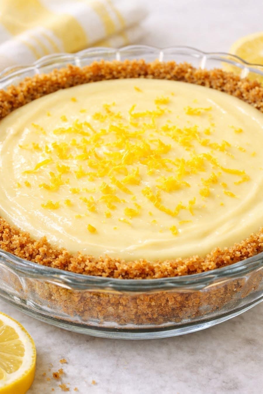 Pour the lemon filling into the prepared graham cracker crust and smooth the top.